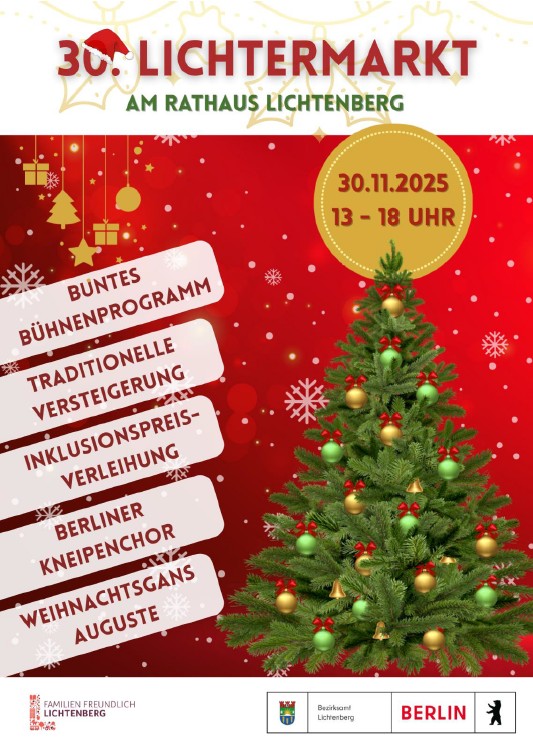 In diesem Jahr folgt nach der gewohnten Versteigerung der Lichtenberger Objekte durch das Umweltbüro die Verleihung des 11. Inklusionspreises. Weitere tolle Programmpunkte, wie der Bläsersound von SozDia, Hits für Kids mit dem Pfefferkuchenkobold, die Tanzshow von Step by step, der “Weihnachtsgans Auguste“ des Wiesenzirkus im Ratssaal, der “Mittagzbänd“ auf der Bühne vor der Schule am Rathaus und dem Abschlusskonzert des bekannten Berliner Kneipenchors, bringen Groß und Klein in Vorweihnachtsstimmung. Der Lichtermarkt ist barrierearm erreichbar und kostenfrei für alle Besucherinnen und Besucher.