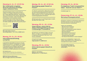 Weitere Veranstaltungen stehen auf der Internetseite der Gleichstellungsbeauftragten. Um vorherige Anmeldung per E-Mail wird gebeten: frauenprojekt@vav-hhausen.de . Die Veranstaltenden bemühen sich, kulturelle Vielfalt und Barrierefreiheit zu berücksichtigen.