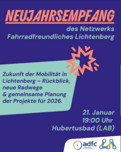 Liebe Aktive für die Lichtenberger Mobilitätswende, liebe Inis,liebe Politiker:innen, wir wollen die in den vergangenen Jahren begonnene Tradition fortsetzen und uns mit Lichtenberger Politiker:innen der demokratischen Parteien vernetzen. Als Netzwerk Fahrradfreundliches Lichtenberg werden wir... Weiterlesen
